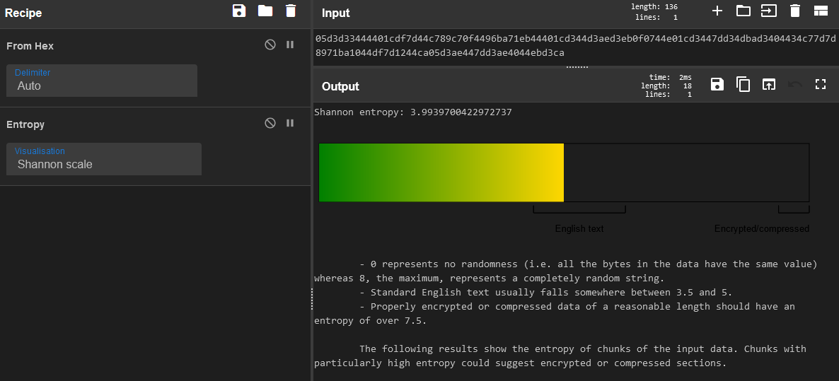 So basically what we’re dealing with is in essence a substitution cipher! Every character in UTF-8 can be represented by another byte. Now there may be a little bit of overlap where two bytes may translate to the same byte, but it hopefully doesn’t happen that often. Regardless, I can run this ciphertext through the Entropy function in Cyberchef to get a feel for what we’re working with (and confirm my suspicion):